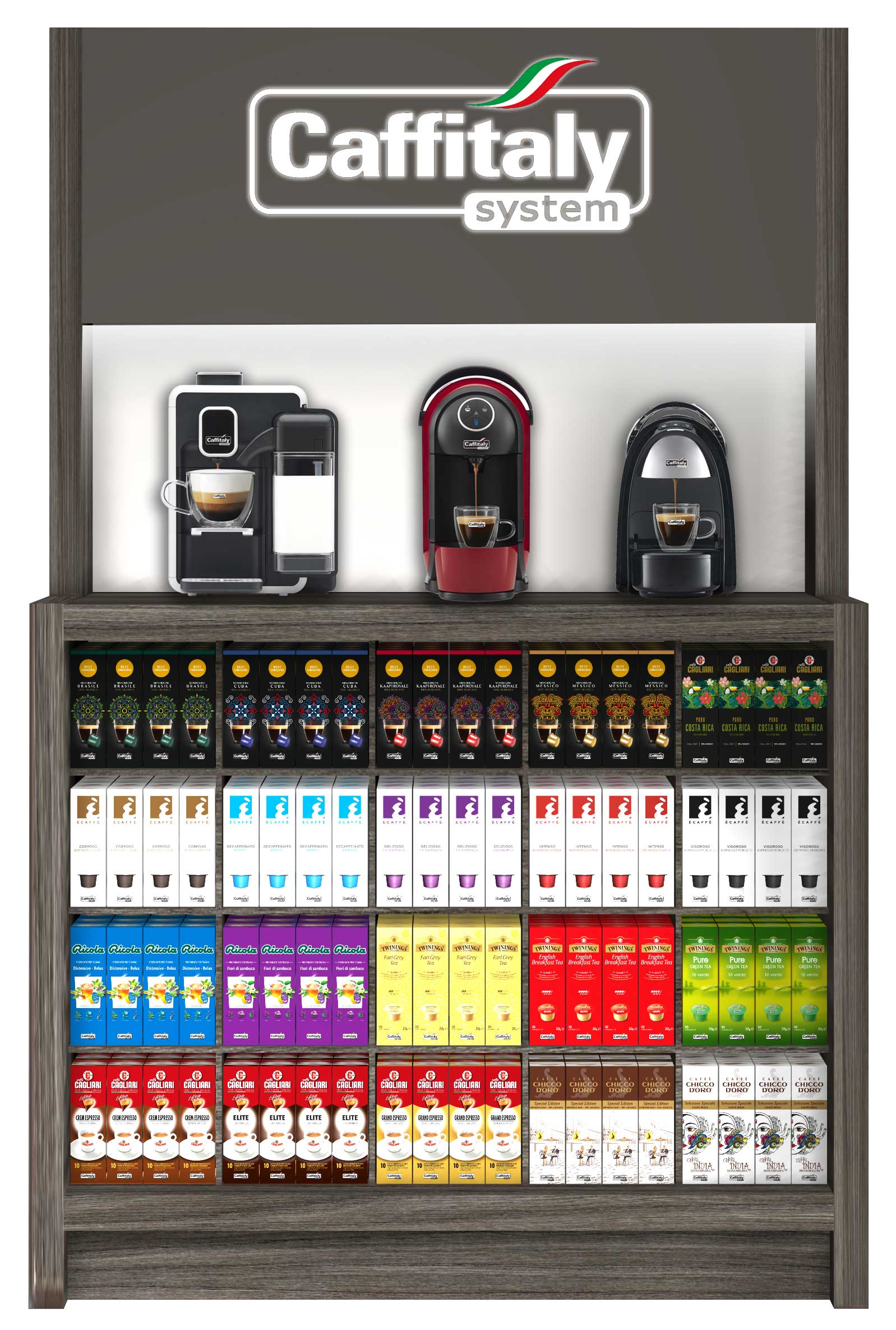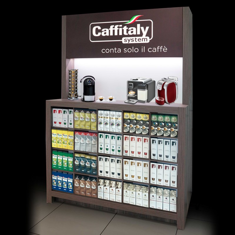 Caffitaly produce e commercializza macchine per il caffè, cialde e capsule, per la distribuzione dei suoi prodotti Ipotesidesign ha progettato diverse linee di espositori destinati a punti vendita di tutte le fasce di mercato. Nei punti vendita più prestigiosi, Caffitaly promuove la vendita dei propri prodotti attraverso un sistema espositivo composto da un alveare inferiore per le diverse capsule ed un parte superiore luminosa per la presentazione e la prova delle macchine per il caffè. La strategia è di abbandonare la vecchia idea di semplice servizio di esposizione e vendita, puntando sull’esperienza attraverso la creazione di una zona break.
