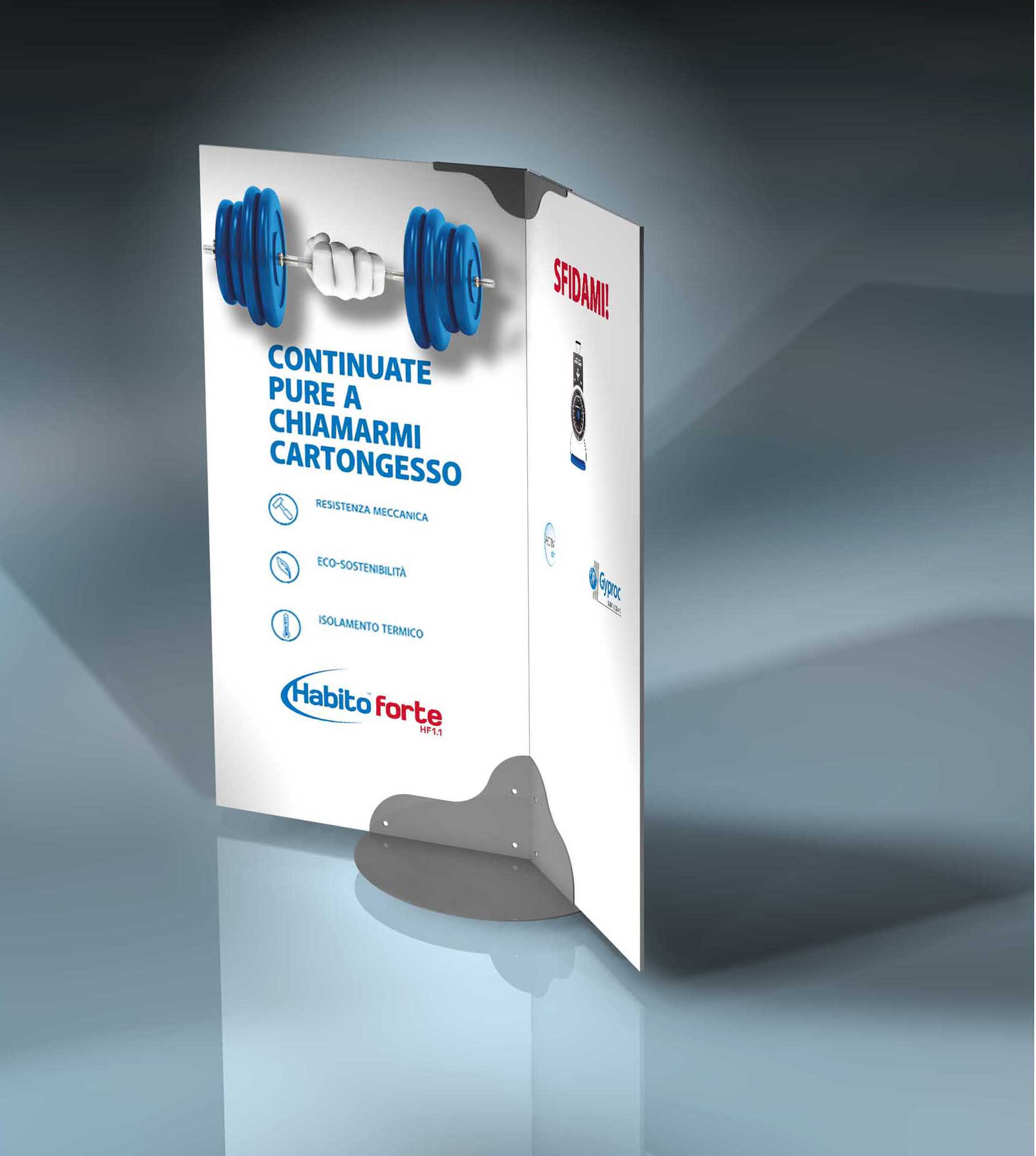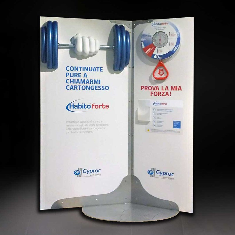 Quale è il modo migliore per smentire un pregiudizio? Provare il contrario! La prova della forza del cartongesso è un semplice test effettuato con una vera bilancia: la strategia di comunicazione fa leva sulla forza dell'esperienza diretta dell'utente mette alla prova la portata del materiale. Per realizzare questo concept fornito dall'agenzia di comunicazione abbiamo messo in campo tutta la nostra esperienza garantendo una soluzione costruttiva stabile (benchè discreta visto che il vero espositore di sè è lo stesso cartongesso). Fondamentale per la riuscita del progetto sono state la creatività e manualità del nostro Mario Setti nel realizzare il pugno e i pesi 3D... che forza!